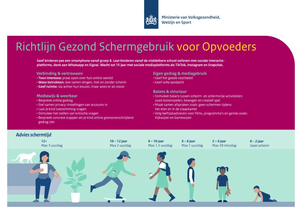 In de richtlijnen komen ook schermtijdadviezen voor verschillende leeftijdscategorieën aan bod. Ook is er onder meer aandacht voor de (voorbeeld)rol van ouders, de zogenaamde 20-20-2-regel, het maken van afspraken en het praten over mediagebruik.