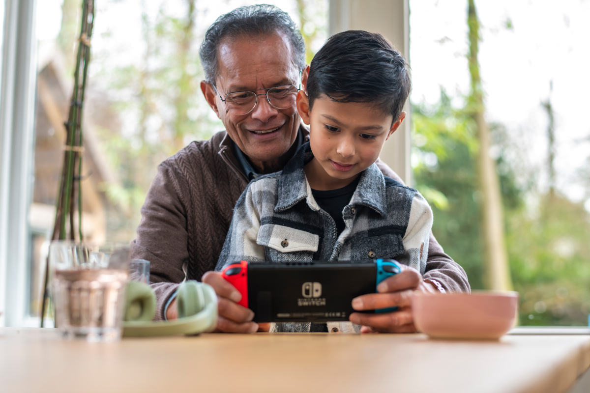 kind zit op schoot van ouder. ze zijn samen bezig met een tablet.