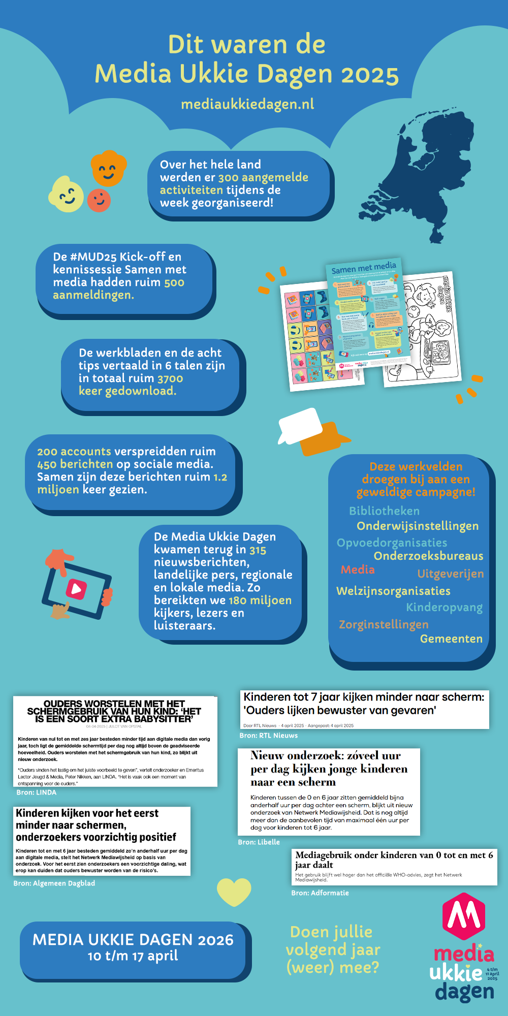 We willen graag heel veel dank uitspreken aan alle netwerkpartners, professionals, organisaties, ouders, opvoeders, media, bloggers en anderen die tijdens de Media Ukkie Dagen 2025 geholpen hebben om de mediaopvoeding van de allerkleinsten onder de aandacht te brengen. De campagne zit erop maar mediaopvoeding gaat door!