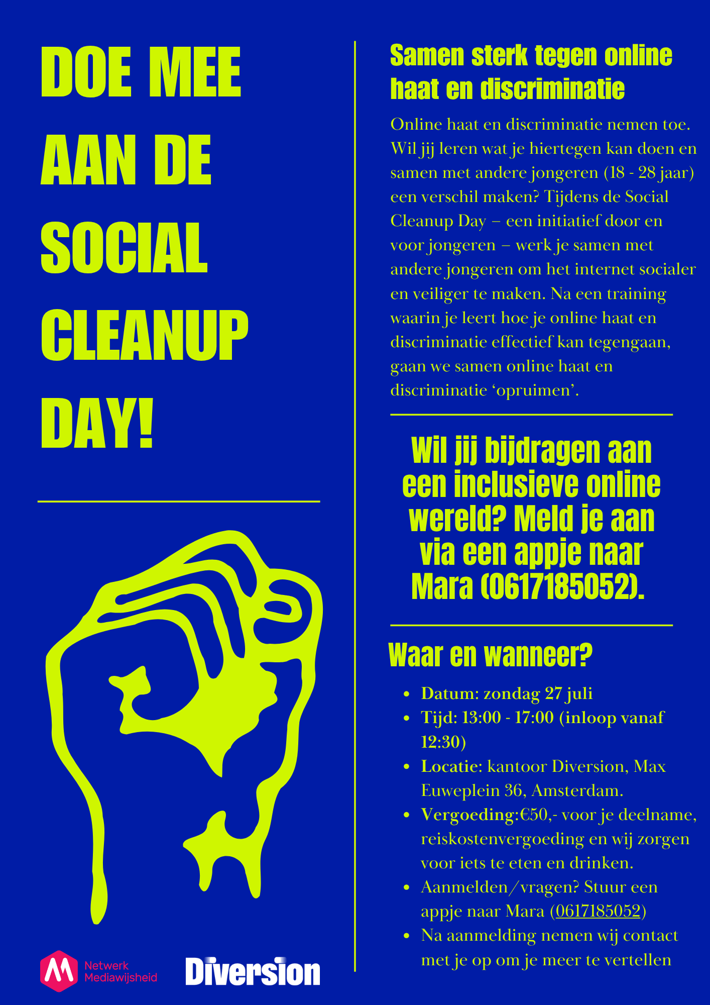 27 juli vindt er opnieuw een Social Cleanup Day plaats, met weer een nieuwe groep jongeren. Ken jij jongeren die willen leren hoe ze samen in actie kunnen komen tegen online haat en discriminatie? Deel deze flyer met hen om de impact te vergroten.