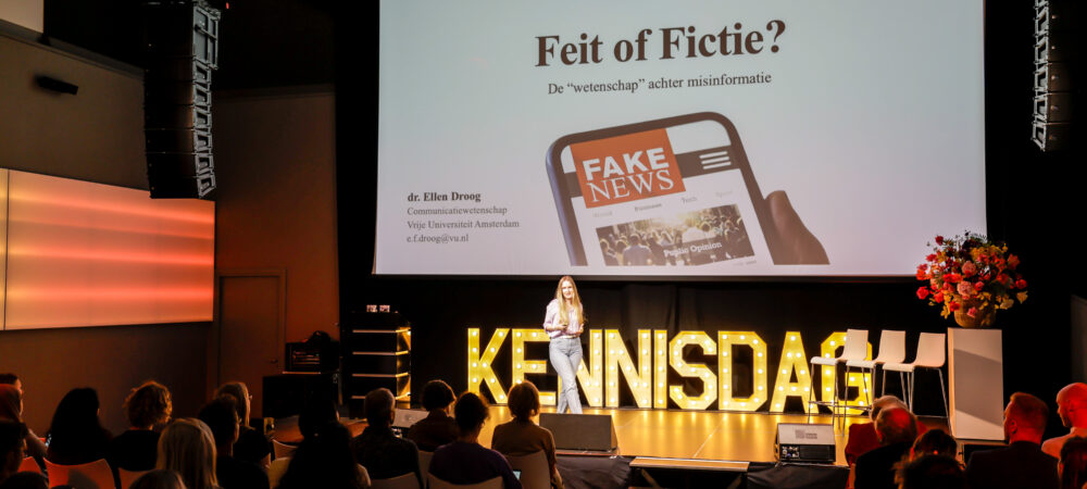 Communicatiewetenschapper Ellen Droog (Vrije Universiteit Amsterdam) opent met een heldere keynote over de psychologie achter misinformatie. We geloven misinformatie niet omdat we ‘dom’ zijn, maar omdat we mensen zijn met gevoelens, twijfels en een behoefte aan houvast. Angst, hoop en herkenning spelen daarin een grote rol. “We willen grip houden op het leven, en misinformatie speelt daar slim op in.” Die misinformatie komt in allerlei vormen voorbij: van influencers die beweren dat je kanker kunt genezen met kruidenthee tot deepfakes die nauwelijks van echt te onderscheiden zijn. Vooral emotionele berichten verspreiden zich snel via sociale media. En hoe langer je op die platforms zit, hoe groter de kans dat je complottheorieën tegenkomt én gelooft.”